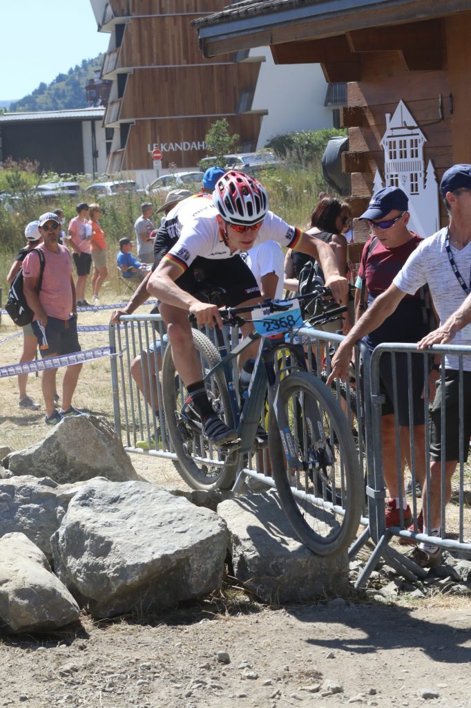Gestartet sind wir am vergangenen Donnerstag um 04.00 Uhr in Richtung Frankreich – endlich das erste MTB Rennen der Saison – dann auch noch gleich ein UCI Rennen der Junior Series in Alpe D’Huez. Dort hat das BDR Nationalteam U19 mit 4 Starterinnen und 7 Startern teilgenommen. Aufgrund der weiten Anreise und evtl. auch wegen Covid19 waren zusätzlich nur wenige weitere deutsche Teilnehmer am Start. Gegen 15.00 Uhr waren die 1.100 km Anfahrtsweg über die Schweiz in die französischen Alpen geschafft. Von 16.00 bis 18.00 Uhr stand ein erstes Kennenlernen der Strecke auf dem Plan. Was soll man sagen: Bei einer Streckenlänge von ca. 4km nur ein Anstieg mit ca. 140 Hm, eine mit technischen Einlagen versehenen Abfahrt und einem weitläufigem und flachen/schnellen Streckenteil rund um Start bzw. Ziel in einem Skigebiet auf ca. 1.900m über Meeresspiegel … kein Baum, kein Strauch, einfach nur Staub und Schotter, viel Sonne und Gegenwind im Anstieg. Die Motivationskurve ging da eher nach unten. Das waren „prima“ Voraussetzungen für das Rennen am Samstagnachmittag.