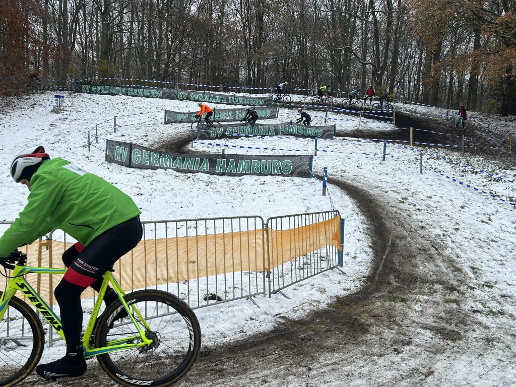 Letztes Wochenende stand für mich das Highlight der diesjährigen Cyclocross Saison an, die UCI Masters Weltmeisterschaft in Hamburg. Die Trainingszeiten waren laut Veranstaltungsprogram sehr begrenzt, also reiste ich schon am Donnerstag an, um mir den Kurs anzuschauen. Die Strecke war eigentlich schnell und relativ einfach, jedoch bildete sich durch Frost und Schneefall an vielen Stellen ein eisiger Untergrund, sodass die Sturzgefahr in den Kurven relativ hoch war. Hinzu kam, dass der Kurs mit zunehmenden Rennen am Freitag und Samstag an einigen Stellen auftaute und schlammig wurde. Also Matschreifen drauf und los gings, Donnerstag und Freitag habe ich mich gut gefühlt und kam auch gut mit der Strecke zurecht.