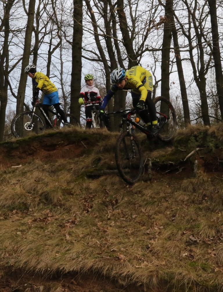 Nach dem etwas herausgezogenen Frühstück schloss sich dann um 10 Uhr bei kühlen 0°C das Fahrtechniktraining im Wald an. Jeder fuhr mehre Male einen vorbereiteten Slalomparcour mit natürlichen Schanzen, Rampen und Gräben. Uphill ging es dann über den einen oder anderen Baumstamm – auch dies will beherrscht werden und spart im Wettbewerb eine Menge Zeit. Danach konnte die jungen Biker sich in der nah gelegenen „Sandgrube“ an technisch anspruchsvollen Kanten up- und downhill versuchen. Die Angst vor dem „Überdenlenkergehen“ wich zunehmend und jeder hatte eine Menge Spaß.