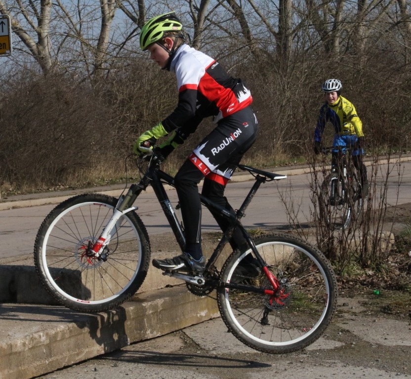 Ab 10 Uhr sollte es bei tollem Sonneschein – aber immer noch ohne Plusgrade – dann trotzdem in die erste Fahrtechnikeinheit gehen. Auf dem Programm stand verschiedene Hindernisse mit dem Rad zu befahren – Geschicklichkeit, Radbeherschung und auch ein bisschen Mut gehörte dazu. Neben verschiedenen Treppen, Betonplatten und Rampen sollte auch ein etwa 80 cm hoher Baumstumpf einer sehr dicken Pappel befahren und darauf mit dem Fahrrad springend eine Kehrtwende gemacht werden. Kein leichtes Unterfangen – jeder schaffte die Auffahrt – mit der Wende muss der eine oder andere aber noch etwas üben. Diese ca. 15 km lange Technikrunde in der Goldenen Aue dauerte etwa bis 12.30 Uhr an.